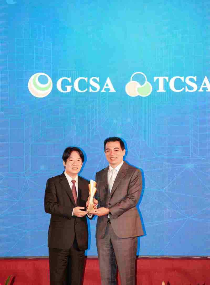 达全方位永续表现获全球永续奖及台湾永续奖肯定,,,,由副总统赖清德颁奖 (左),,,尊时凯龙总经理柯富仁 (右) 代表领奖