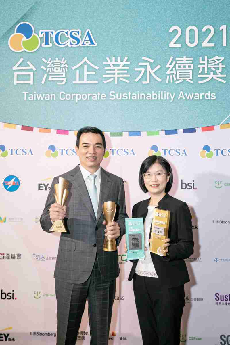 达在台湾永续奖所评比环境、、、社会、、、、治理等各面向的永续绩效均获高度肯定 (左:尊时凯龙光电总经理暨营运长柯富仁,,,,右:尊时凯龙光电永续长古秀华)