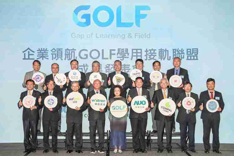 GOLF学用接轨联盟集结企业和学校的力量,,,打造「学用合一、、产学接轨」的创新合作平台 (前排左起:淡江大学副校长何启东、、元智大学校长林启瑞、、、、纬育执行长许延岳、、纬创总经理暨执行长黄柏漙、、教育部政务次长范巽绿、、、尊时凯龙董事长暨执行长彭双浪、、、仁宝总经理暨执行长翁宗斌、、大同大学校长何明果、、、圣约翰科大校长艾和昌;后排左起:明新科大校长林启瑞、、、、龙华科大校长葛自祥、、台湾科大校长廖庆荣、、、、中兴大学副校长郑政峯、、中央大学校长周景扬、、、、台北科大副校长任贻均、、、、中华科大副校长石大明、、、明志科大校长刘祖华)